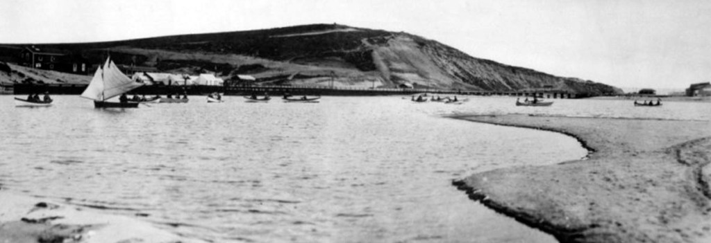 We see Sherman and Clark’s Los Angeles Pacific Railway Company is also building the $200,000 Hotel Del Rey with 50 guest rooms, nearby, with a grand stand overlooking a boat racing course. A bridge is constructed over the mouth of the lagoon, at the ocean’s entrance, with a 1200-foot fishing pier also nearby. Boat racing is becomeing extremely popular. Boardwalks are being constructed and Playa del Rey flourishes as a resort from 1902-1913. However, as we stop to visit the resort in 1913, we are witnessing a fire which ultimately destroys the entire resort, including the Playa del Rey Pavillion and the Del Rey Hotel. Once again, stayed tuned for our continuing time machine travel.