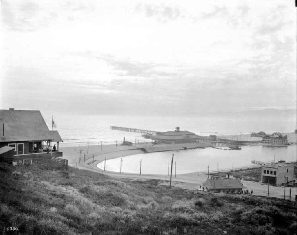Again, we are on the move, moving forward to 1902, when Henry Barbour of the Beach Land Company purchases 1000 acres of land in the same area we now know as Playa del Rey. Barbour is announcing his plans to build a large resort, knowing the Pacific Electric Railway red car: system will connect the downtown Los Angeles area with beach cities from Venice, just steps north from his 1000 acres, south to Redondo Beach area. He succeeds in opening an impressive three-story pavilion, with a restaurant and dining rooms, bowling alleys and a grand dance floor, surrounding the lagoon, today our Playa del Rey Lagoon. The structures were designed and built in Oriental Craftsman motif, opening on Thanksgiving Day in 1904, the same year the resort received its own post office. Playa del Rey was promoted as the “The King’s Beach.”